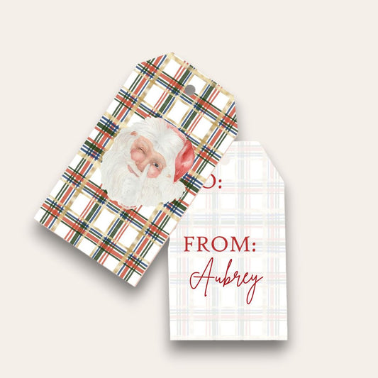 Santa Loves Watercolor Plaid Big Gift Tags (White Edition)